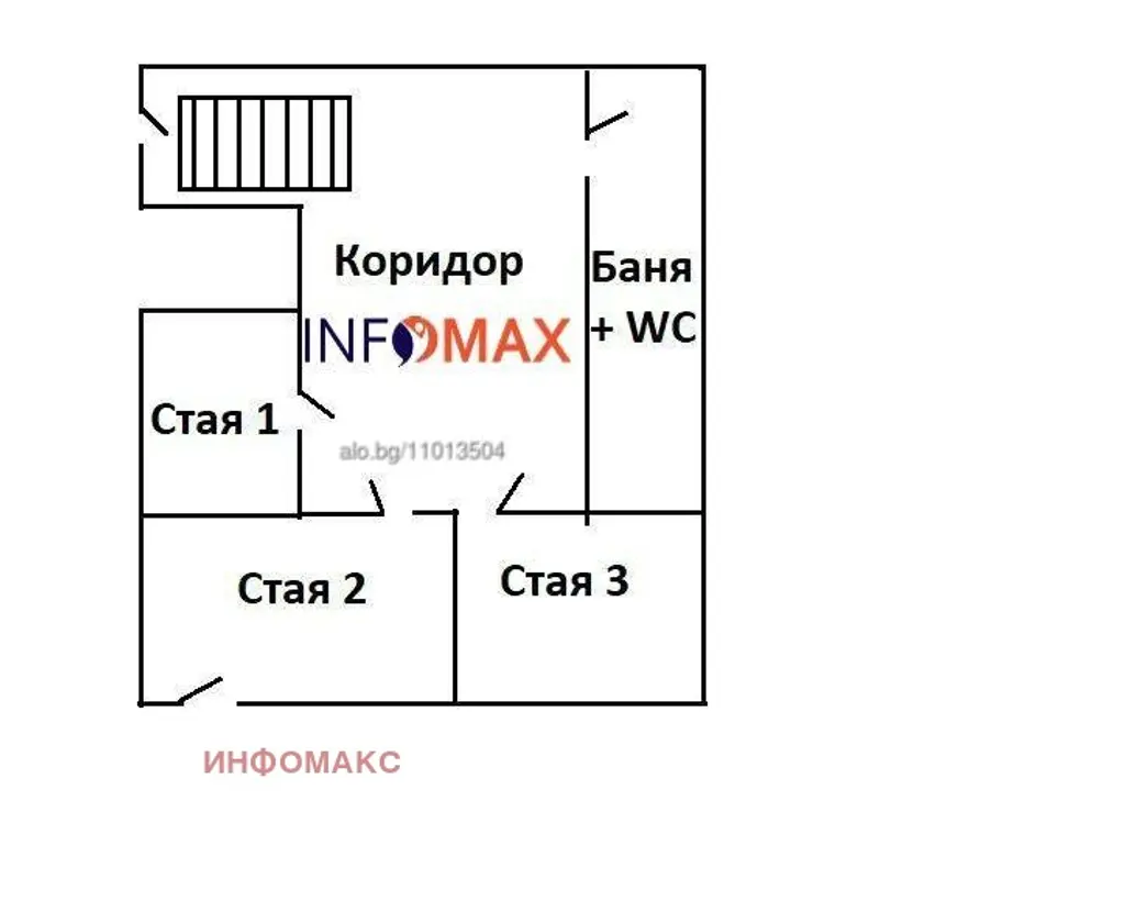 Имотът е с площ от 77 кв.м и предлага функционално разпределение, включващо три самостоятелни стаи, коридор и баня с тоалетна.