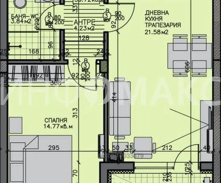 ✅дневна с трапезария и кухненски кът - 21,58 кв.м;