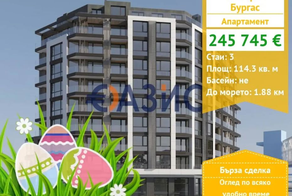 AI обобщениеАпартамент с площ 114 кв.м, разположен на 8-ми етаж в нова сграда в центъра на Бургас.
