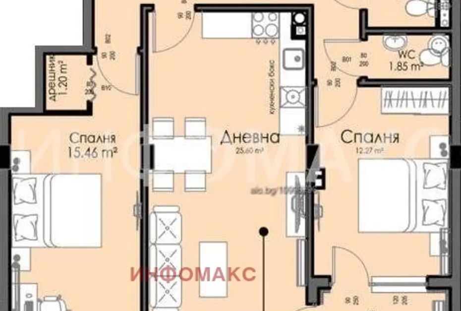 ✅2 спални - 15,46 и 12,27 кв.м.;