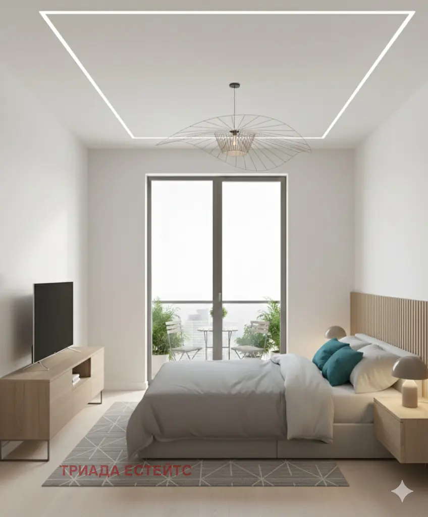 Разпределение: Светла дневна с кът за отдих и хранене, комфортна спалня, функционално антре, баня с тоалетна и панорамна тераса.