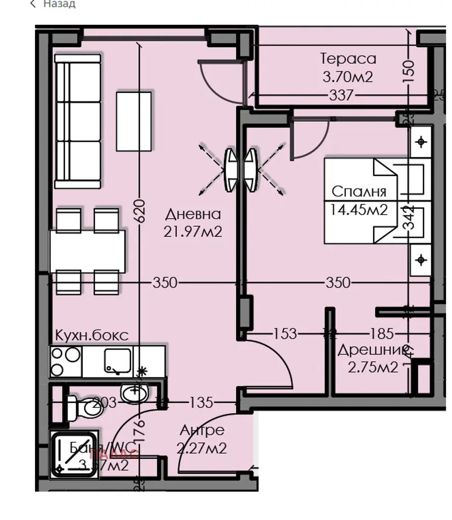 Разпределението включва спалня, дневна с кухненски бокс, баня с тоалетна и тераса с западно изложение.