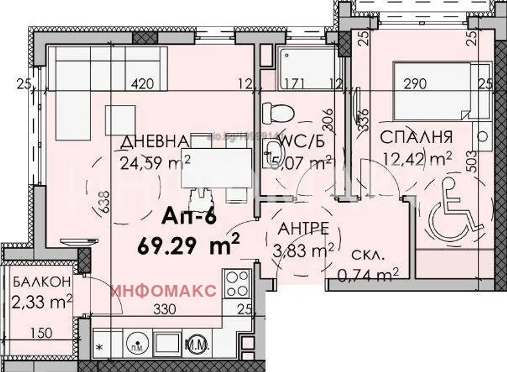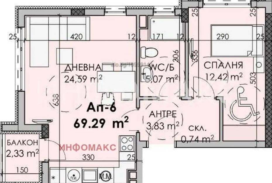 Апартаментът е със следното разпределение: дневна с трапезария и кухненски кът, спалня, склад, баня с тоалетна, антре/коридор и тераса, с обща площ 69,29 кв.м.: