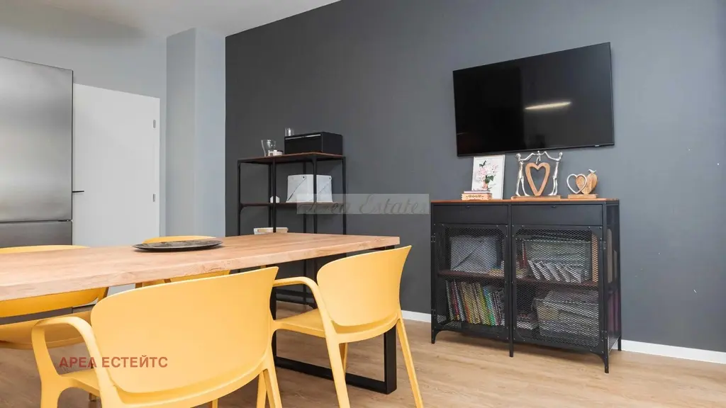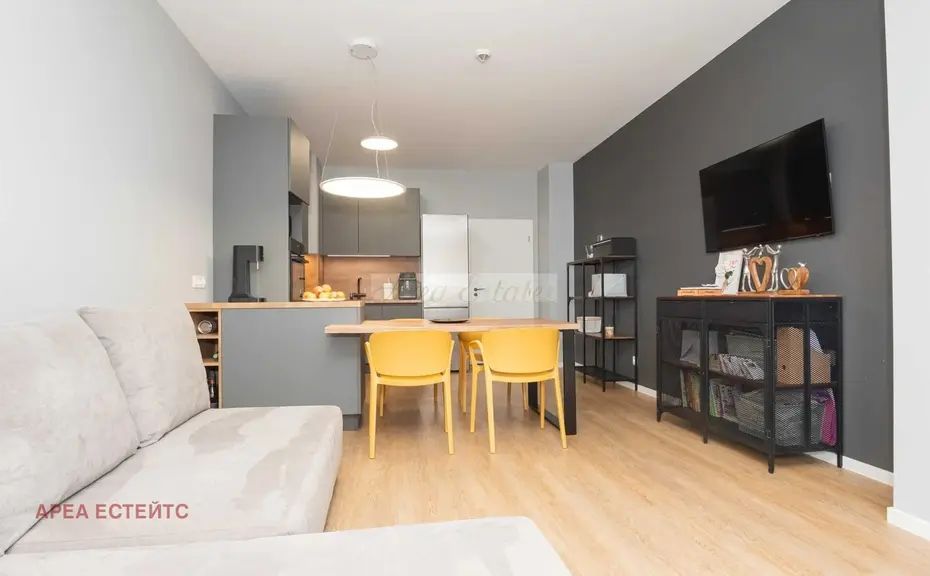 Апартаментът е напълно обзаведен с висок клас мебели и електроуреди ✨. Кухнята е по поръчка от Диалог, оборудвана с вградена техника Electrolux. В хола има диван трансформер от Feydom, който осигурява удобство и функционалност.