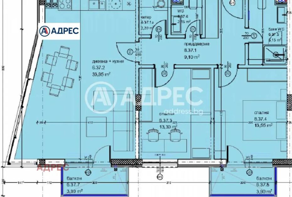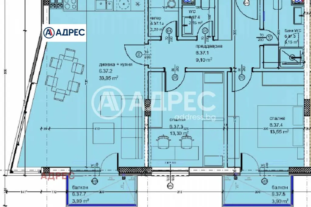 Тристаен апартамент на среден етаж, състоящ се от дневен тракт, две спални, баня с тоалет, тоалет, килер, предверие и две тераси с южно изложение.