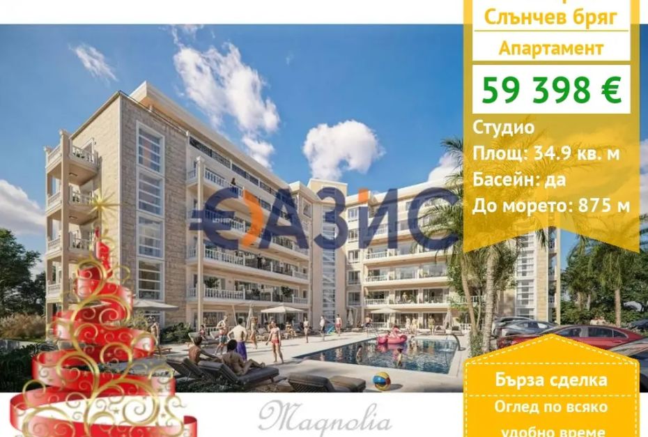 Жилищният комплекс Магнолия 10 е модерен проект в сърцето на Слънчев бряг, създаден за тези, които ценят комфорта, стила и удобството на живот близо до морето. Комплексът се намира в централната част на курорта, само на 700 м от плажа, в спокоен район с отлично развита инфраструктура. На пешеходно разстояние има супермаркети, магазини, аптеки, кафенета и ресторанти идеално за сезонно и целогодишно живеене.