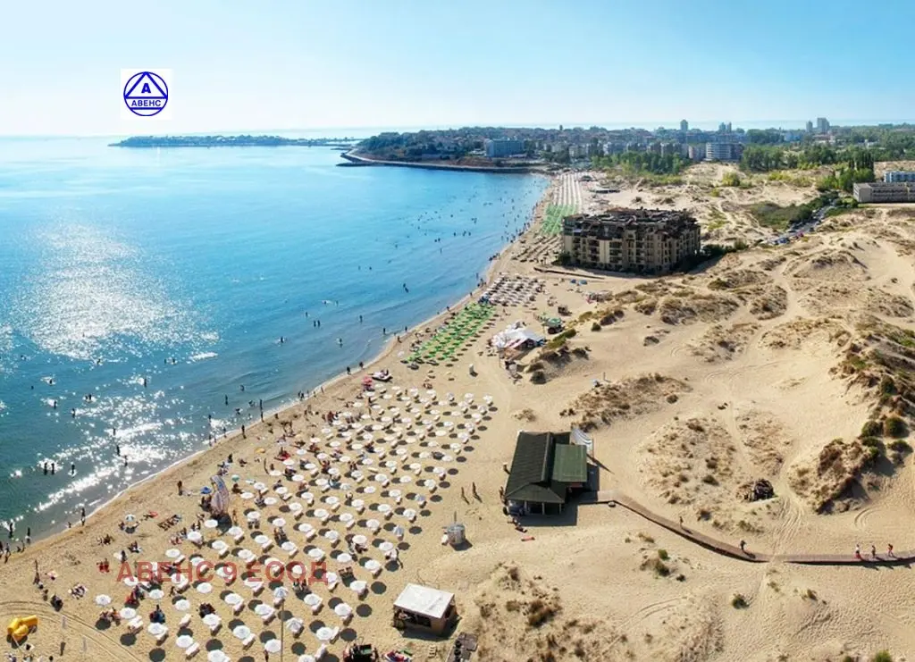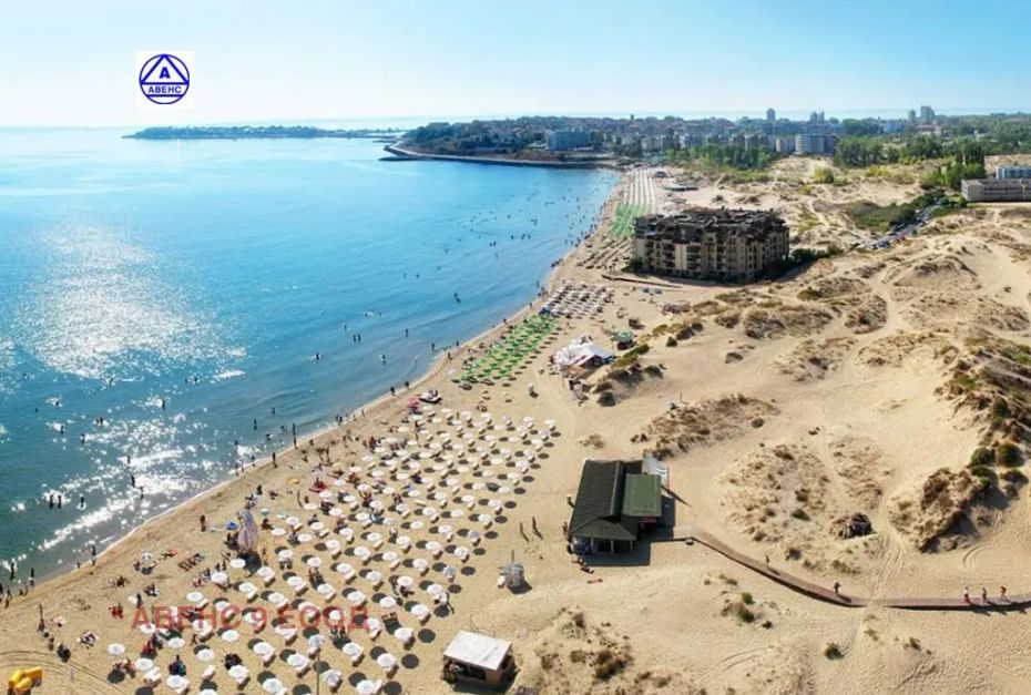 Апартамент до плажа, на първи етаж, над магазини, с гледка към морето.