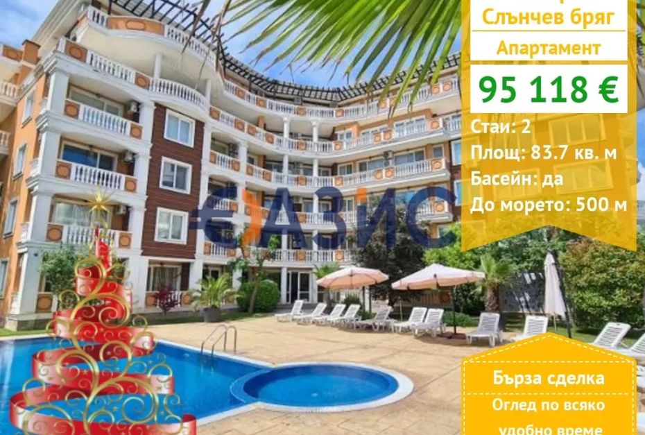 Комплекс 'Вила Ария' се намира в спокойната част на курорта Слънчев Бряг, само на 500 метра от морето. Това е модерна сграда от затворен тип с един главен вход, включваща шест етажа и 80 апартамента: студия от 38 м2 и апартаменти с една спалня от 52 м2. Плановете са обмислени както за лятна почивка, така и за целогодишно живеене. Интериорната декорация е изработена от висококачествени материали, а климатикът е инсталиран като подарък от разработчика.