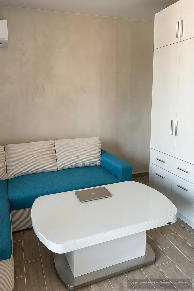 Светъл едностаен апартамент в затворен комплекс с функционално разпределение и модерен дизайн. Обзаведен с всичко необходимо кухненски бокс, обособен спален кът и стилна баня с тоалетна. Ново строителство, удобно електрическо отопление, висок таван, отлична шумоизолация и просторна тераса с изложение Запад и Юг.