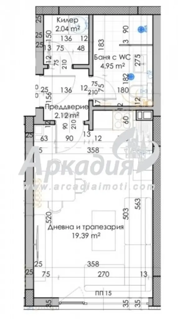 Стаите са функционално разпределени по следния начин - просторна и слънчева дневна с кухненски бокс, входно антре, баня с тоалетна.