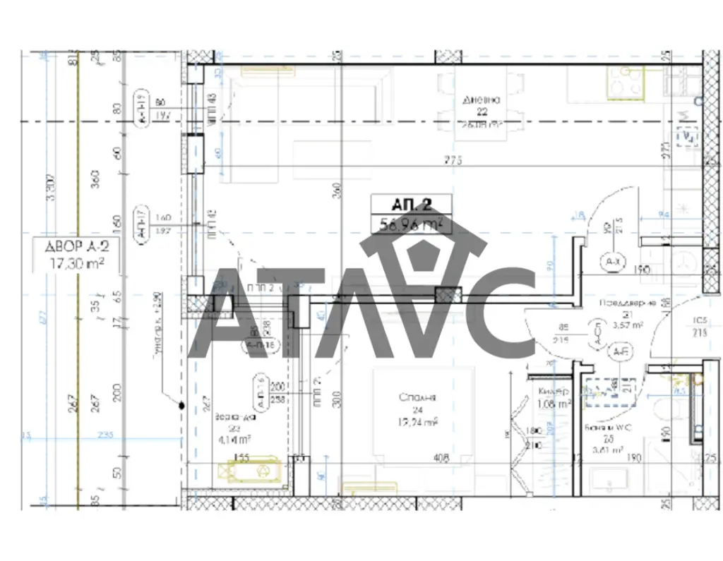 Разпределението включва просторен хол с кухненски бокс, спалня с килер, баня с тоалетна, входно антре, веранда и двор.