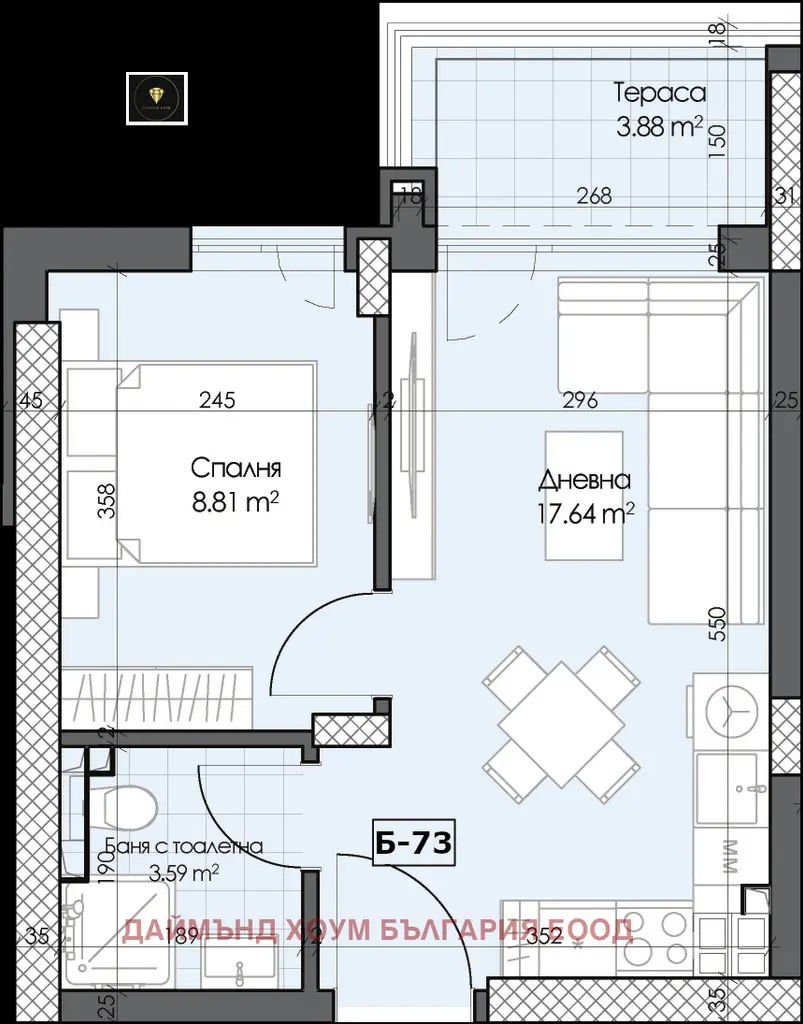 📐разпределение: Входно антре, дневна с трапезария и кухненски бокс, спалня, баня с WC и тераса.