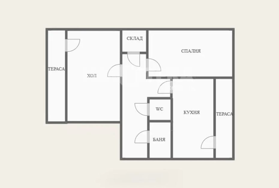 Състои се от: отделна дневна, самостоятелна спалня, склад, кухня, отделно баня и тоалетна, две тераси.