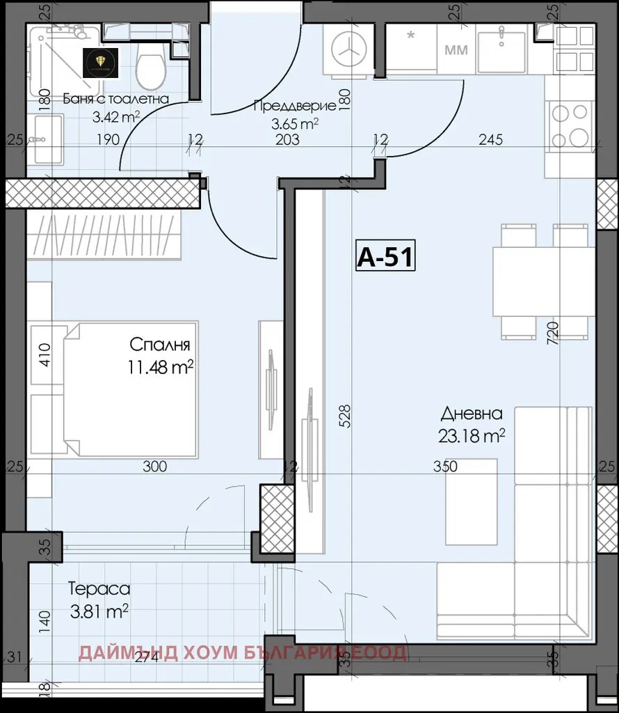 📐разпределение: Входно антре, дневна с трапезария и кухненски бокс, спалня, баня с WC и тераса.