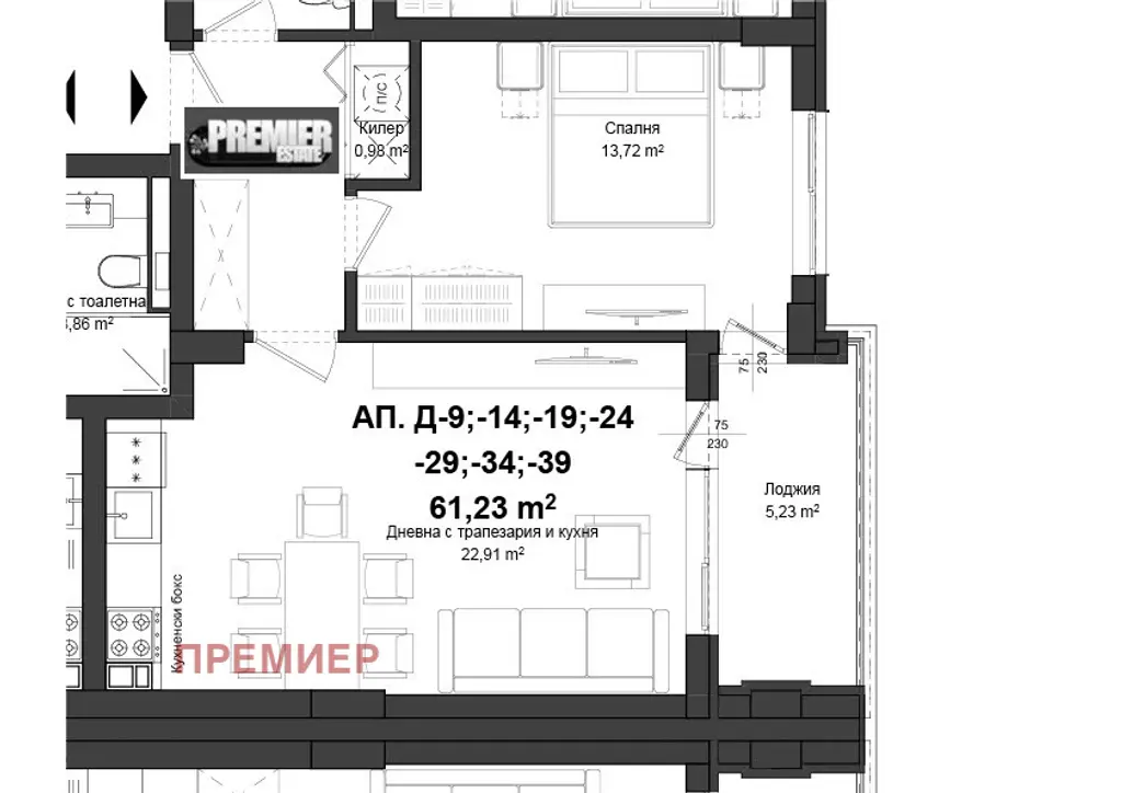 Дневна с трапезария и кухненски бокс, спалня , баня с wc , килер, терасa