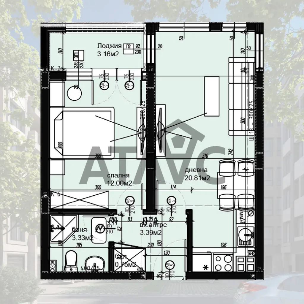 Жилището е със следното разпределение: антре, хол с кухненски кът и трапезария, спалня, баня с тоалетна, склад и тераса.