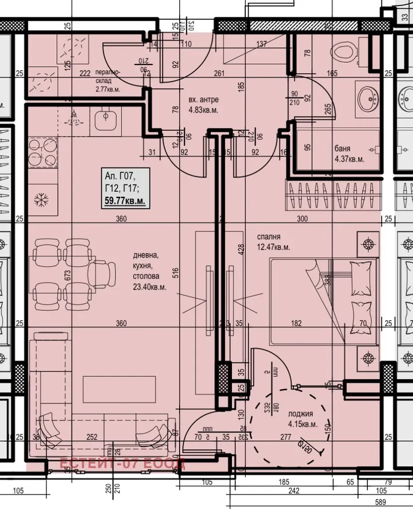 Предлаганият двустаен апартамент е част от нов жилищен комплекс с четири тела в квартал Христо Смирненски, Пловдив. Сградата е тухлена, с очаквана година на завършване 2028 г. Апартаментът е разположен на трети етаж от общо шест и предлага функционално разпределение: хол с кухня около 24 кв.м., спалня 13 кв.м., баня 4 кв.м., склад 3 кв.м. и тераса-лоджия 5 кв.м. Общата площ е 71 кв.м., а чистата жилищна площ 60 кв.м. Комплексът няма да бъде затворен тип, но ще разполага с удобства, характерни за такива. Локацията в квартал Христо Смирненски осигурява достъп до градска инфраструктура и удобства.
