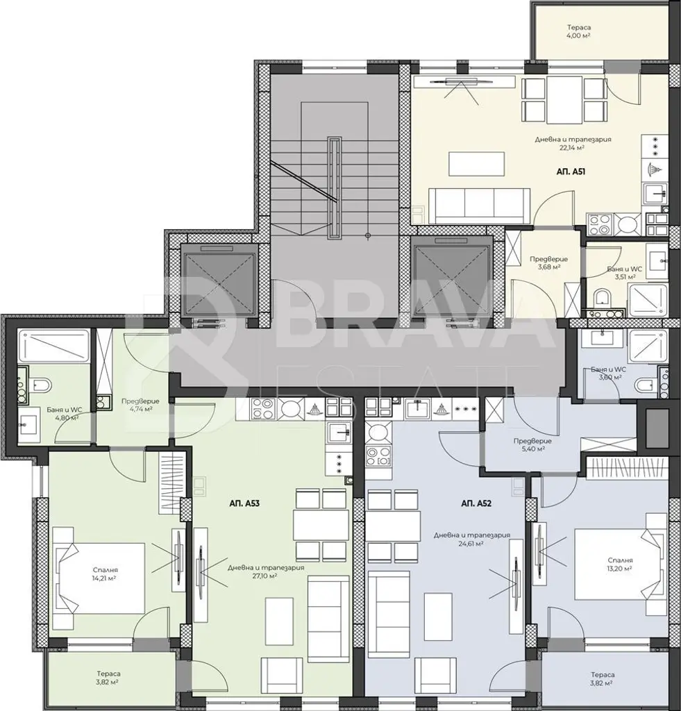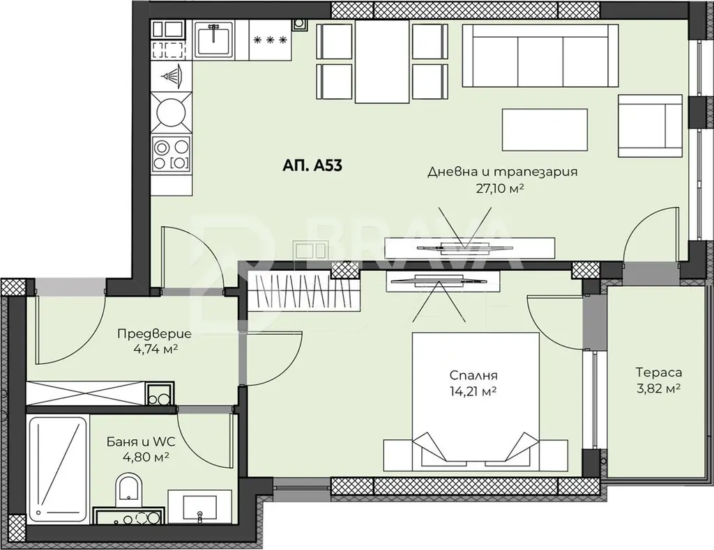 Разпределението включва удобни и просторни помещения с обща площ от 79 кв.м, подходящи за ежедневна употреба.