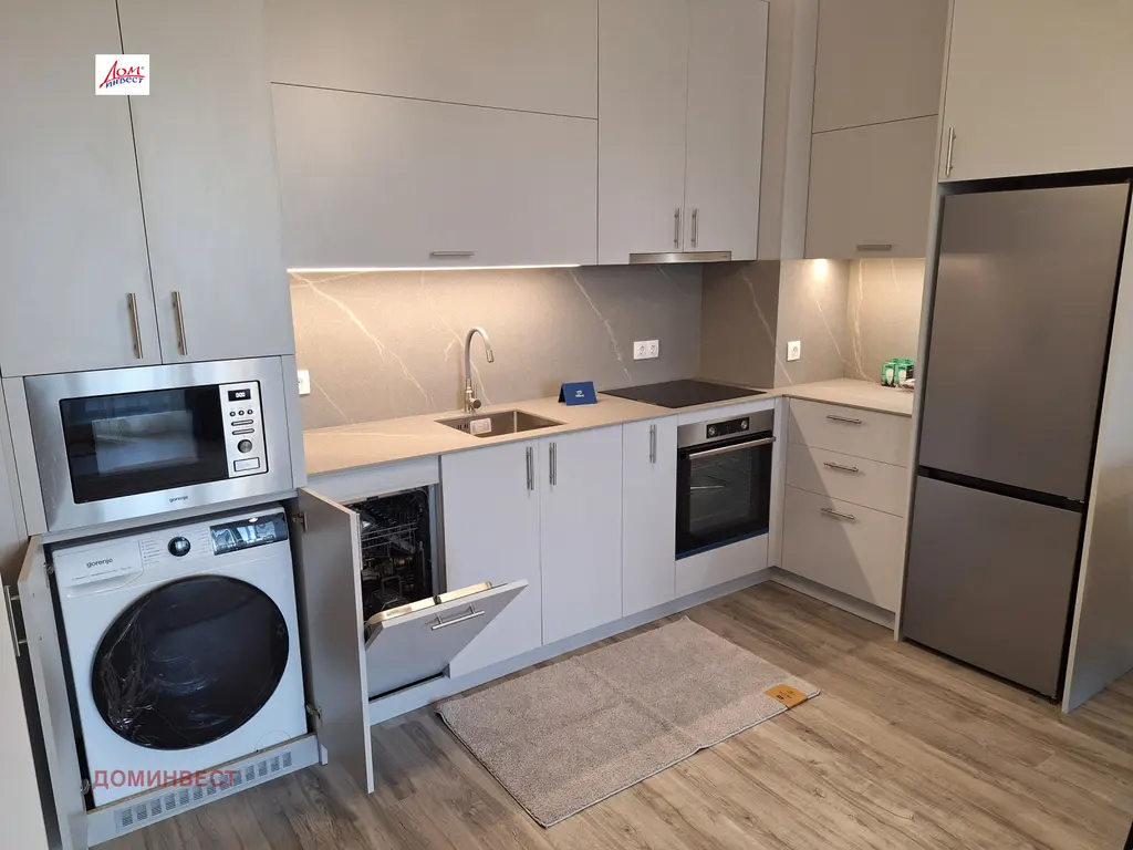 Апартаментът е оборудван с пералня със сушилня, миялна, микровълнова, индукционни котлони, фурна, аспиратор, хладилник с фризер, смарт телевизор, плотове и гърбове на кухнята с изключително красив, здрав и безвреден материал на Ламинам, два климатика, ел.бойлер,ТЕЦ и топла вода с индивидуален топломер и водомер (като опция, в момента е изключен за апартамента). За терасата има маса с два стола. Дограмата е висок клас. Прозорците са със завеси блякаут, с пердета и комарници. Има килими, пътеки и стелки.