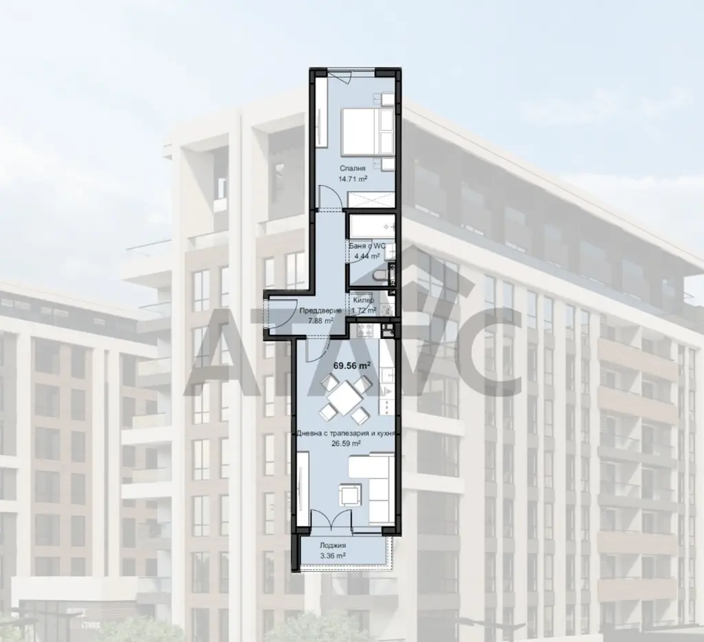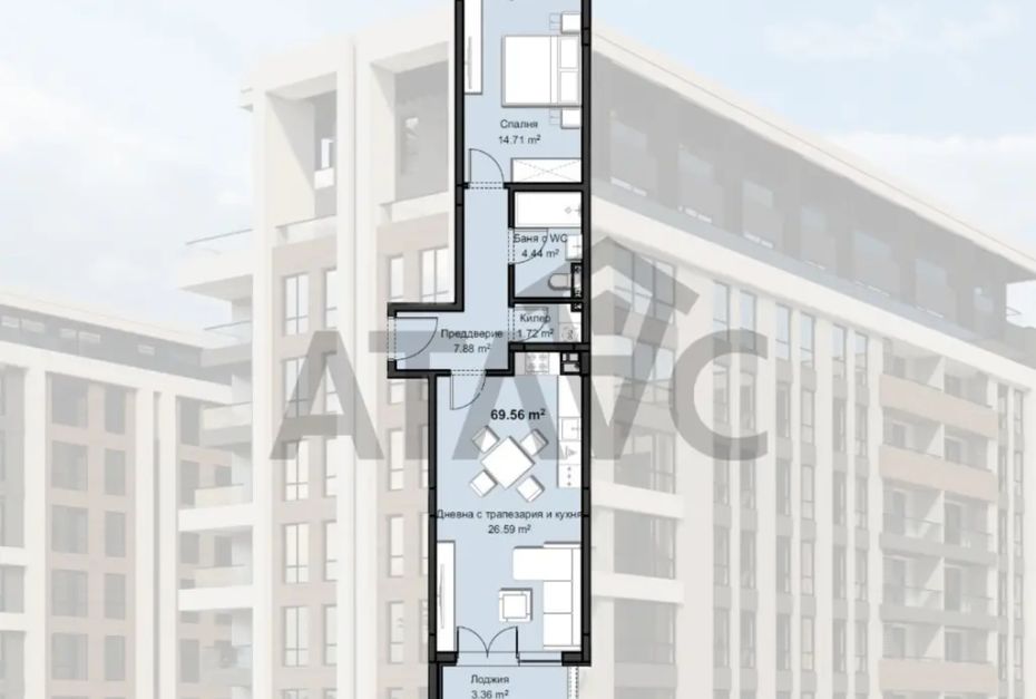 Жилището е с площ от 69.56 кв.м и включва дневна с кухненски кът, спалня, санитарно помещение, предверие, килер и лоджия.