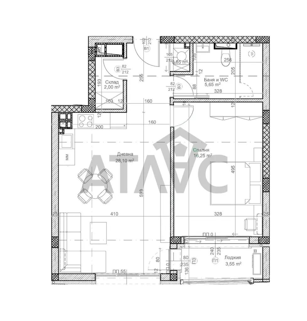 Имотът се намира в малка, бутикова сграда на 7 етажа с модерна визия и ограничен брой апартаменти. Разпределението е практично и функционално - светла дневна с кухненски бокс и място за хранене, самостоятелна спалня, баня с тоалетна, входно антре, склад и балкон.