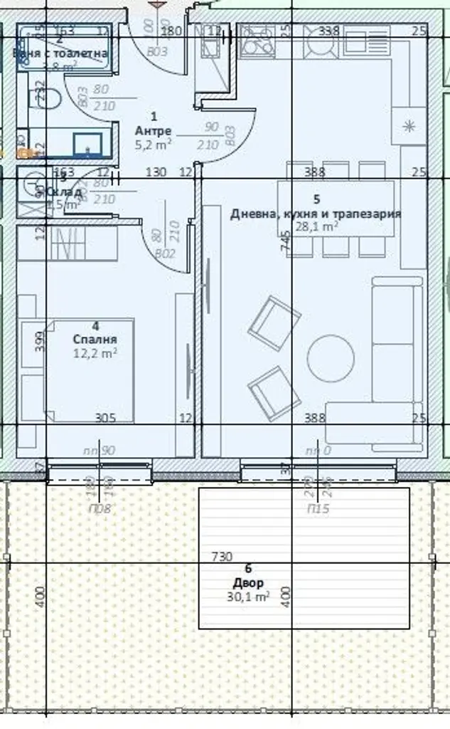 Двустайният апартамент е ситуиран на партерен жилищен етаж и разполага с площ от 66кв.м., разгърната в следното практично разпределение: Входно антре, дневна с кухненски бокс, спалня, баня с тоалетна, склад, двор - 30,1 кв.м.