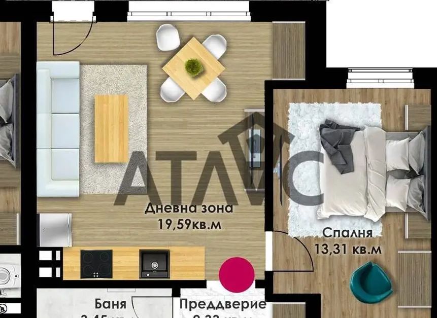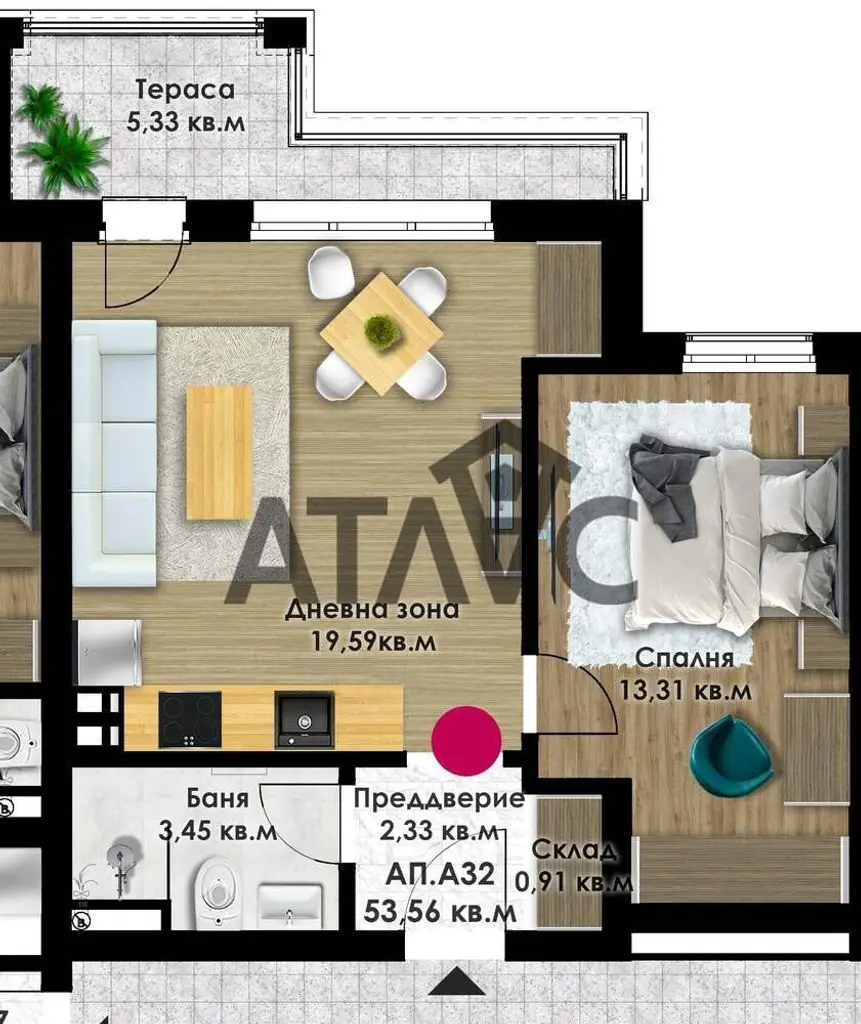 Двустайно жилище състоящо се от антре, склад, дневна с кухненски кът, спалня, баня с WC, и тераса.