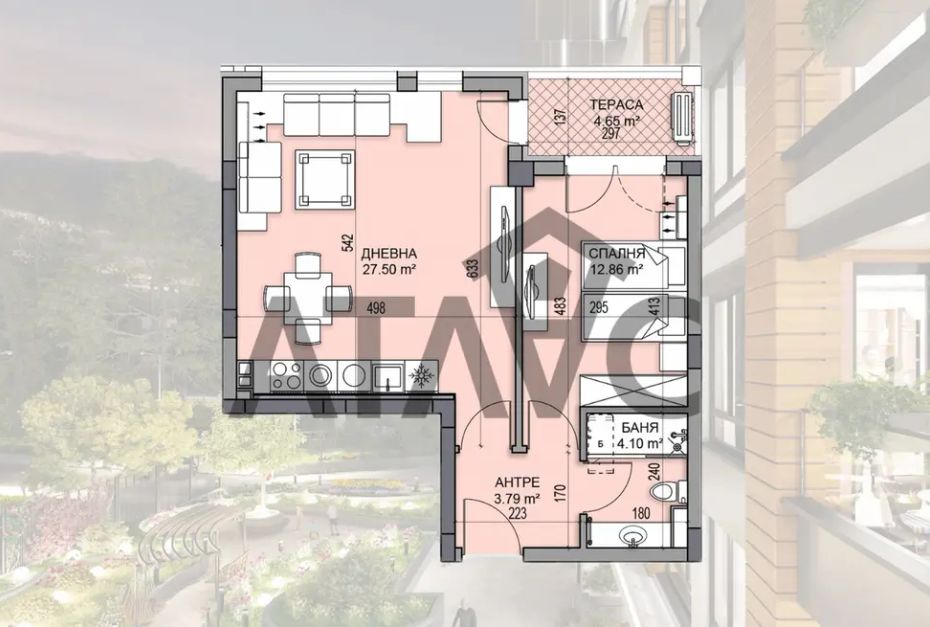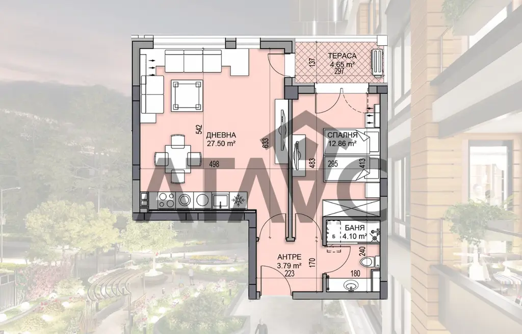Апартаментът се състои от всекидневна с кухненски бокс и трапезария, спалня, баня с тоалетна, тераса и входно антре.