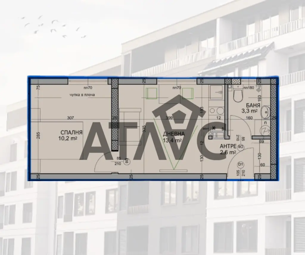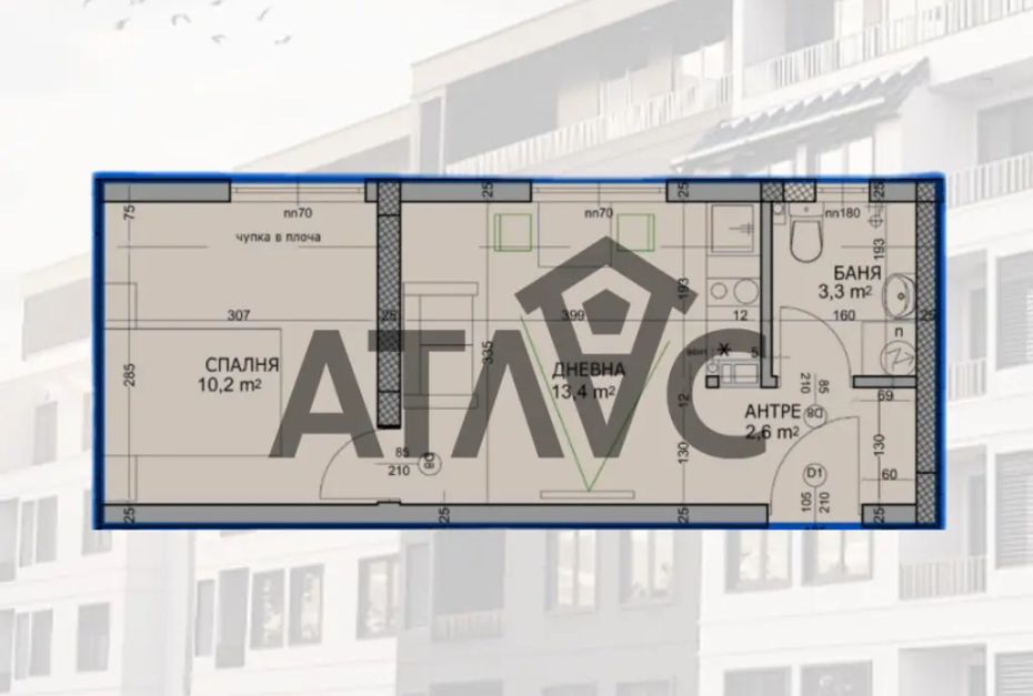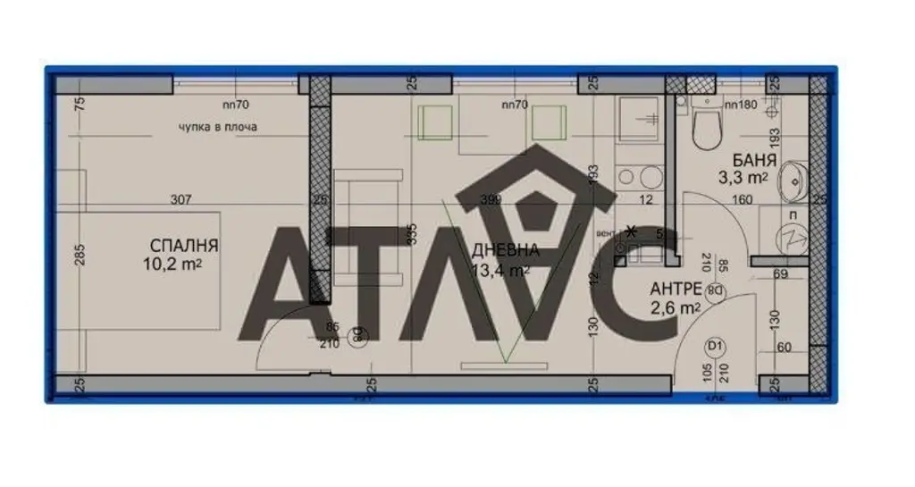 Разпределението включва хол с кухненски бокс, спалня, баня с тоалетна и антре, като към имота има и избено помещение.