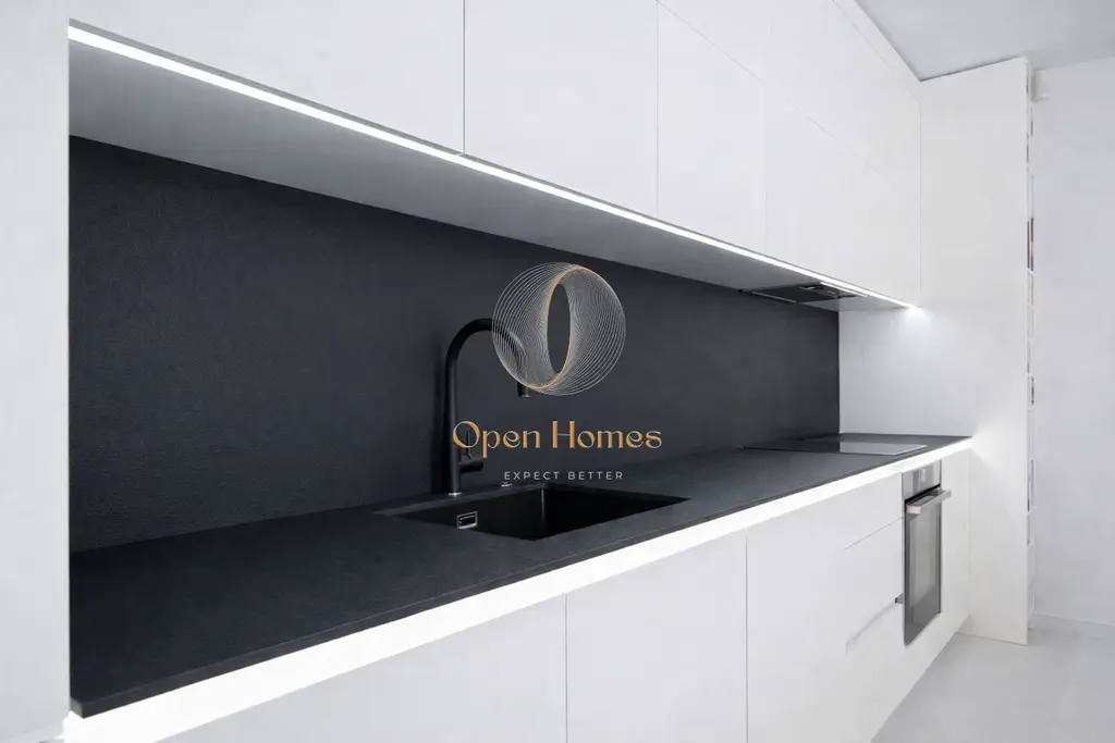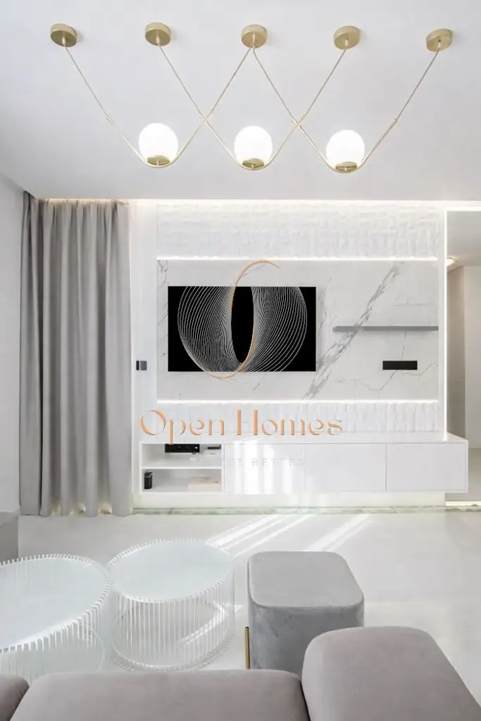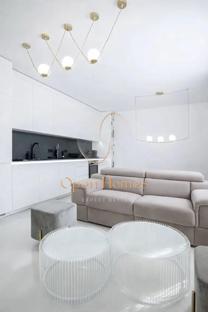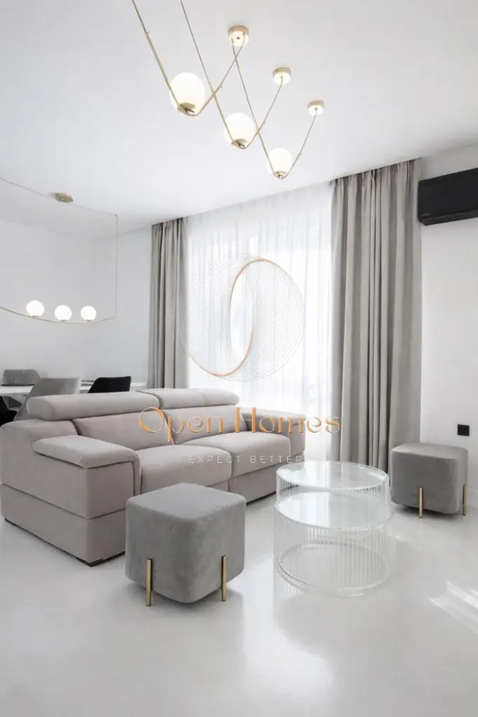 Интериорът който впечатлява с чисти линии и дизайнерски мебели по индивидуален проект, създаващи усещане за простор и чистота, 60 кв. м. добре организирано пространство.