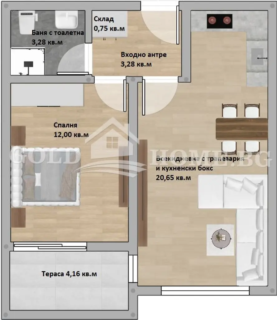 Входно антре, дневна с трапезария и кухненски бокс, спалня, баня с тоалетна, склад и тераса.