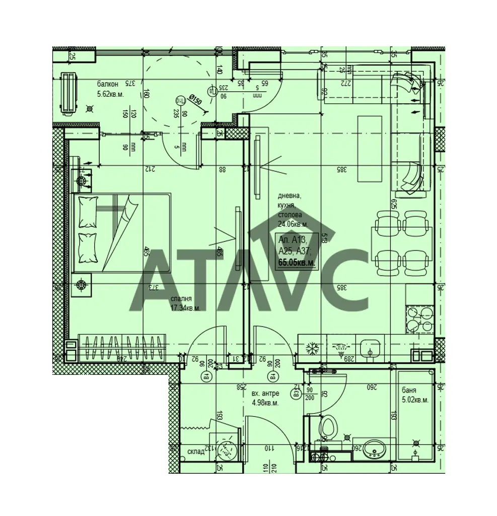 Апартаментът е разпределен в просторен хол с кухненски бокс и трапезария, спалня, баня с тоалетна, входно антре, килер и тераса.