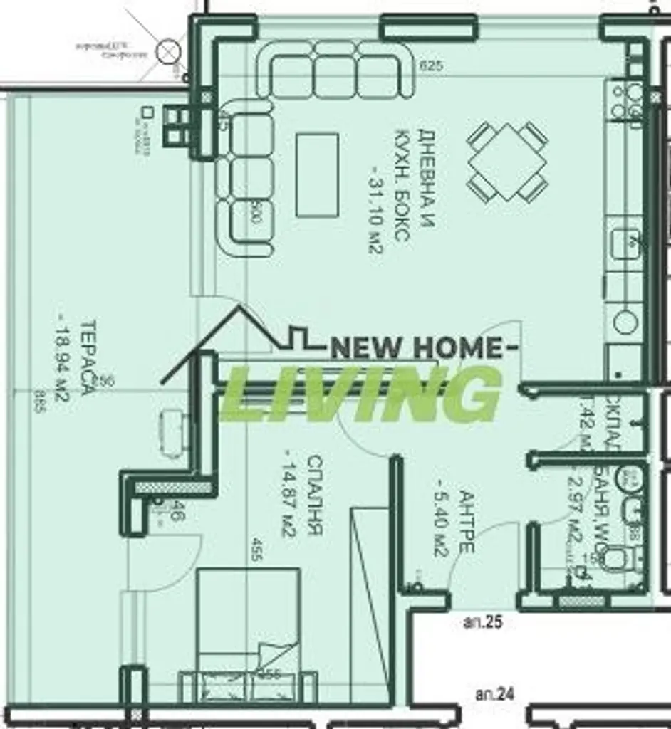 Жилището е разпределено в голям хол с кухненски кът и трапезария, голяма спалня, коридор, тераса и склад.