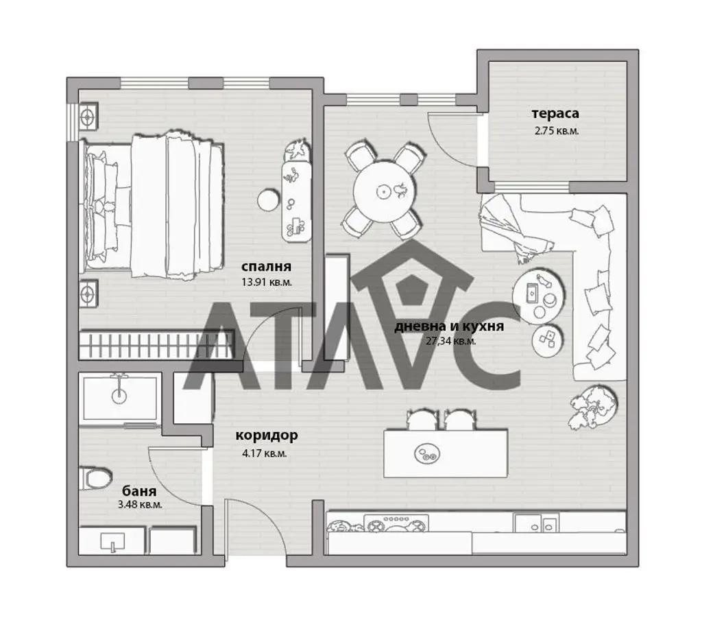 Апартаментът е с добре обмислено разпределение и включва светъл хол с кухненски бокс и трапезария, спалня, баня с тоалетна, практичен килер и тераса, подходяща за релакс. Жилището е проектирано с акцент върху комфорта и качеството на живот. За удобство на бъдещите собственици се предлага възможност за закупуване на паркомясто в комплекса.