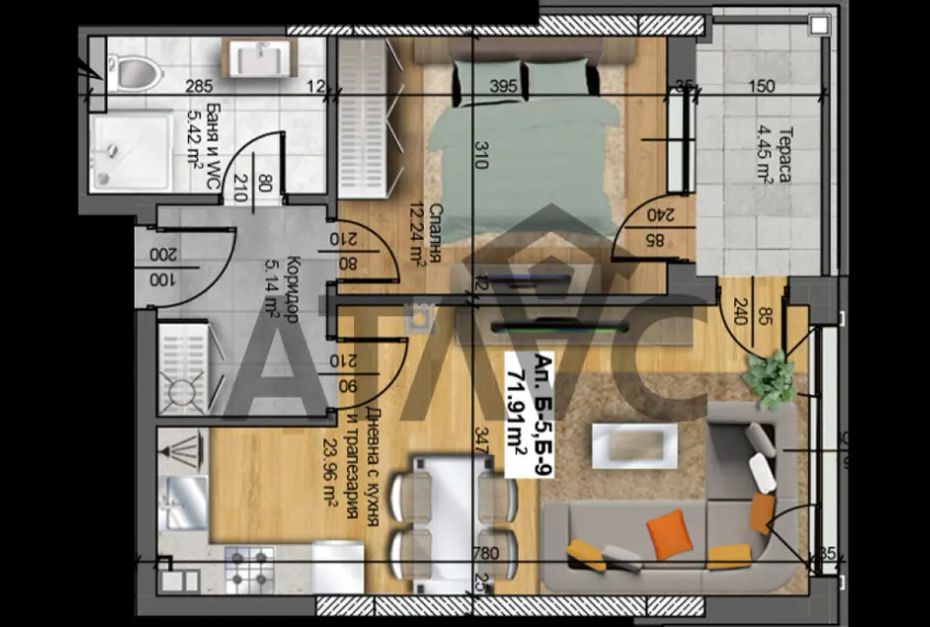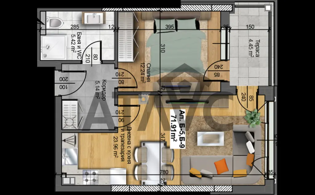 АТЛАС НЕДВИЖИМИ ИМОТИ предлага двустаен апартамент в новострояща се бутикова сграда в района на Гребна база. Функционално разпределение във всекидневна с излаз към тераса, спалня, входно антре, баня.