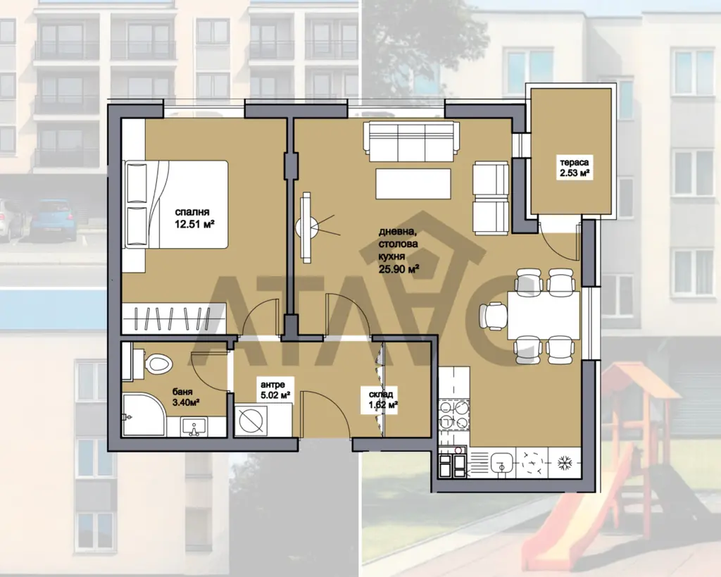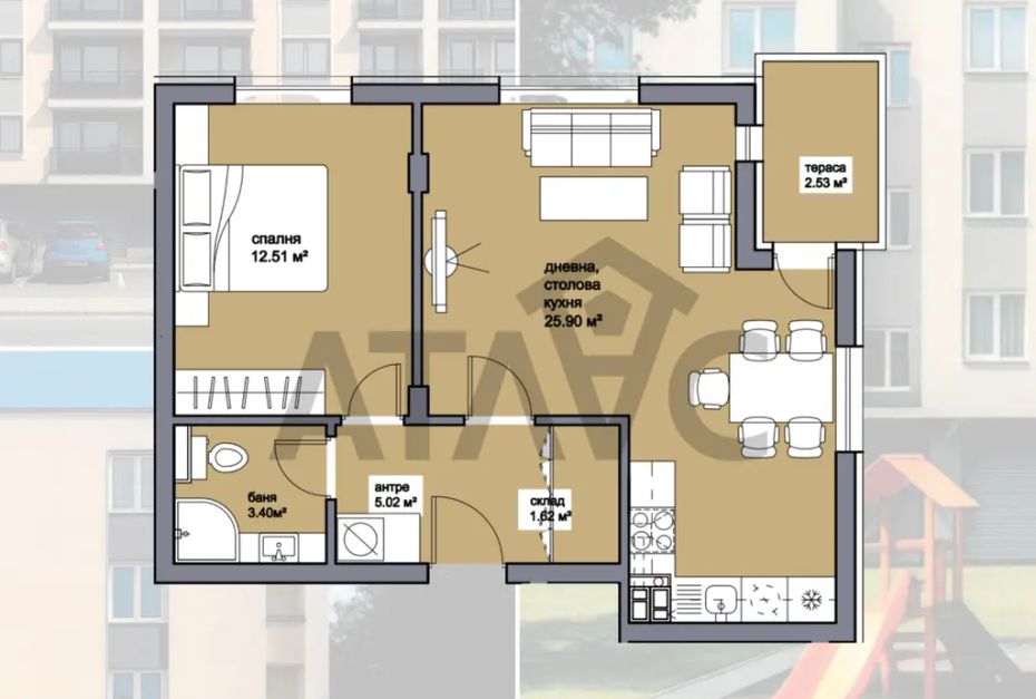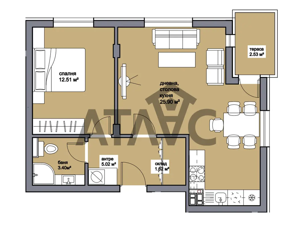 Апартаментът, който Ви предлагаме е с отлично разпределение и реално усещане за простор. Дневната е голяма и удобна, с ясно обособени зони за кухня, трапезария и отдих, плюс излаз към тераса. Спалнята е правилна и лесна за обзавеждане, банята е функционална, а към антрето има собствено складово помещение - сериозен плюс за ново строителство. Цялостното разпределение е комфортно, практично и подходящо както за първи дом, така и за инвестиция.