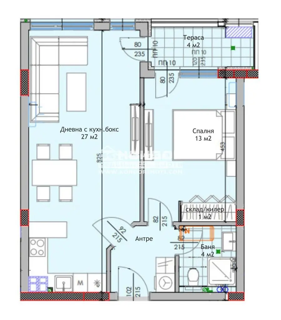 Разпределението включва дневна с трапезария и кухненски бокс (27 кв.м.), самостоятелна спалня (13 кв.м.), баня с тоалетна, антре с място за гардероб, килер/перално помещение и тераса, обща за двете стаи.