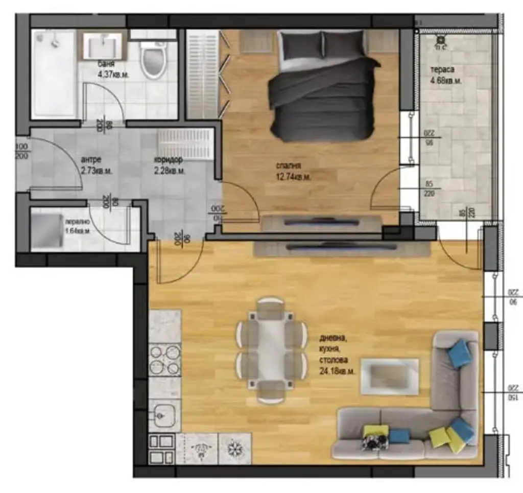 Жилището, което предлагаме за продажба е двустайно с източно изложение, състои се от дневна с кухненски бокс и трапезария-24,18 кв.м, спалня -12,74 кв.м, баня с тоалетна, входно антре, перално помещение и тераса. Обща площ 73,18 кв.м.