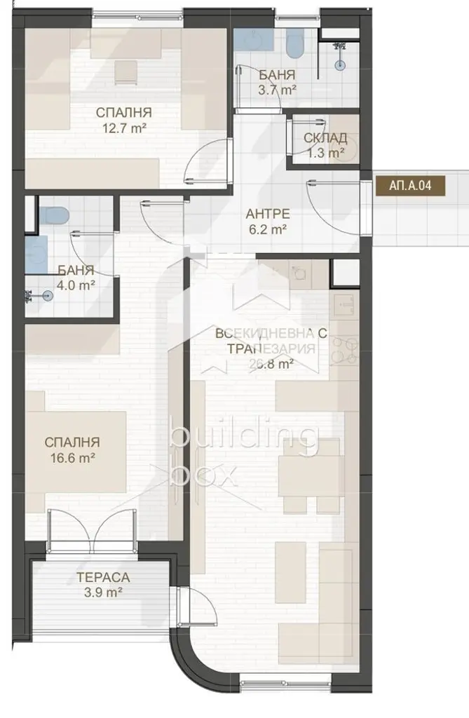 - РАЗПРЕДЕЛЕНИЕ: Голяма всекидневна с кухненски бокс - 26 кв.м, две спални с площ от 16 кв.м и 12 кв.м, две бани с тоалетни и антре.