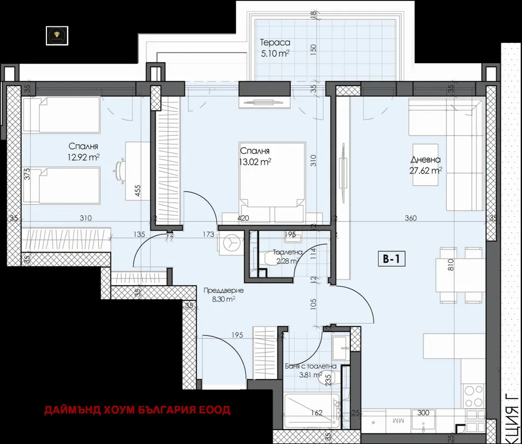 📐разпределение: Входно антре, дневна с трапезария и кухненски бокс, 2 спални, баня с wc, wc, склад и тераса.