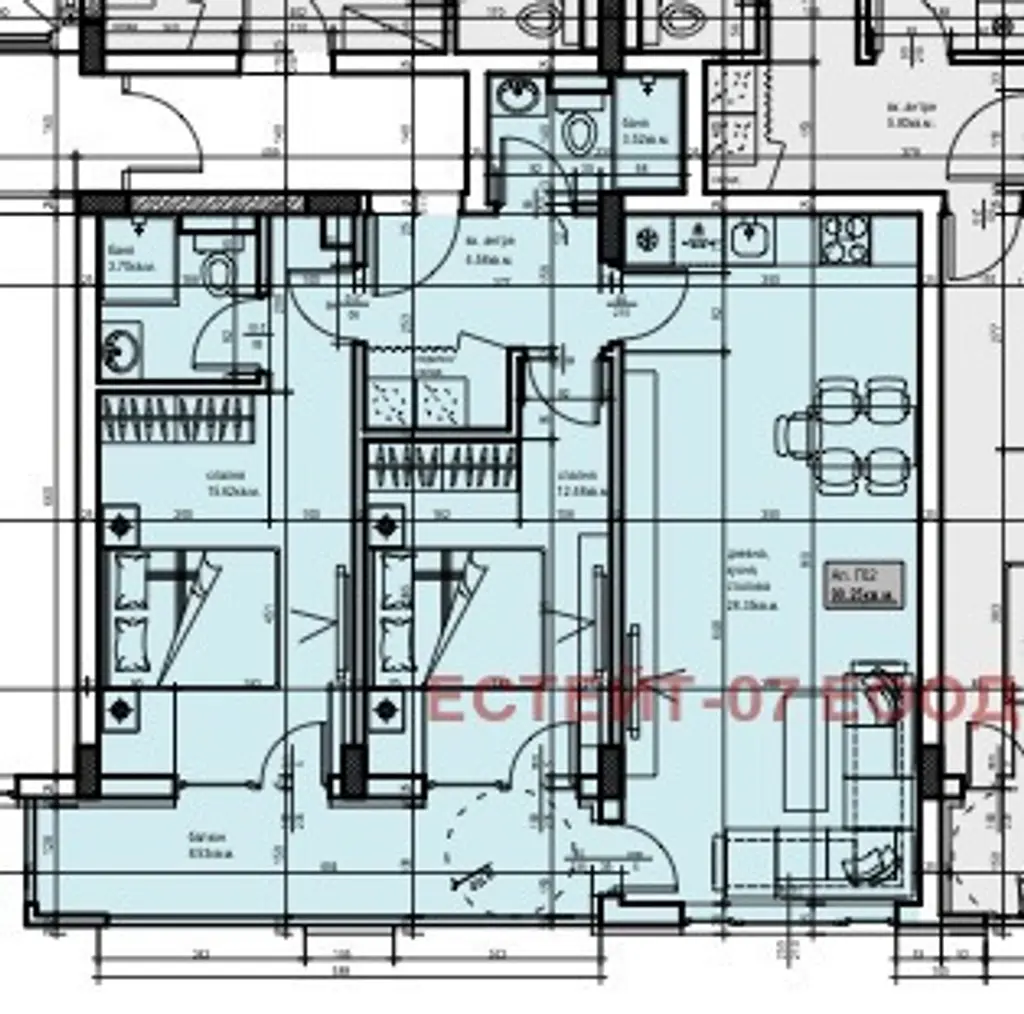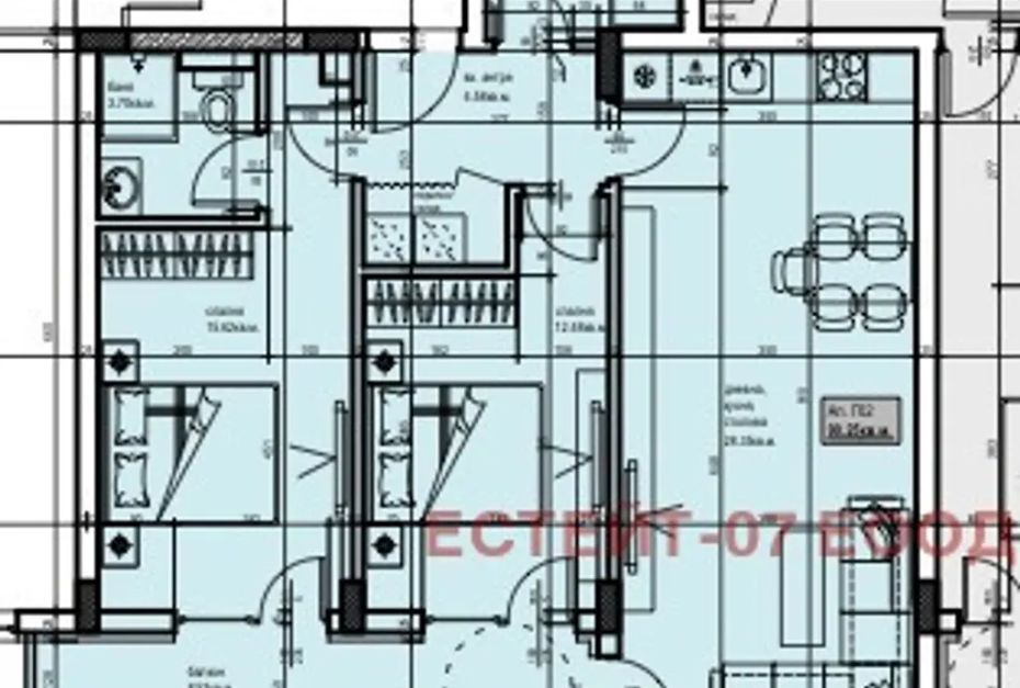 Разпределението включва хол с кухня (29 кв.м.), две спални (13 и 15 кв.м.), баня, склад и тераса лоджия (5 кв.м.), с чиста жилищна площ 60 кв.м.