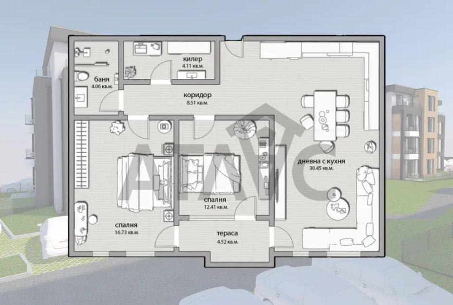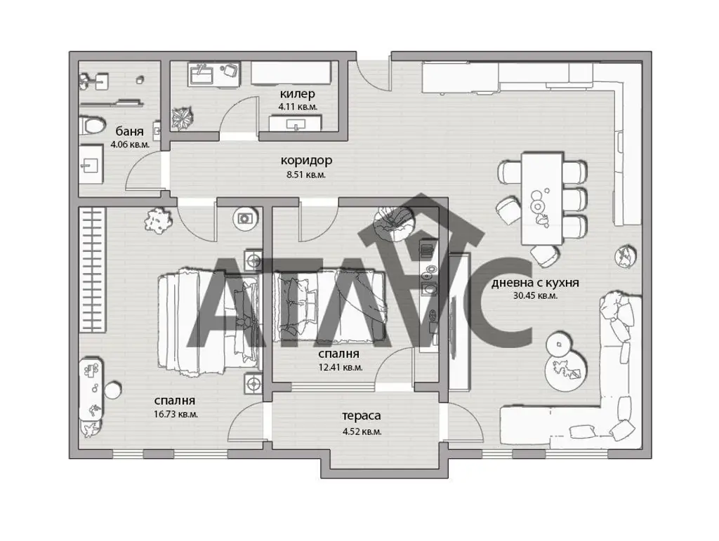 Апартаментът е с добре обмислено разпределение и включва светъл хол с кухненски бокс и трапезария, две просторни спални, баня с тоалетна, практичен килер и тераса, подходящи за релакс. Жилището е проектирано с акцент върху комфорта и качеството на живот. За удобство на бъдещите собственици се предлага възможност за закупуване на паркомясто в комплекса.