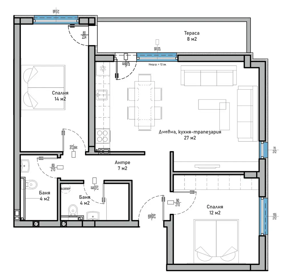 Жилището, което Ви представяме е тристайно с , състои се от ъглова дневна 27кв.м. с трапезария и кухненски бокс и излаз на обща тераса 8кв.м., две самостоятелни спални; 12 и 14кв.м., две бани с тоалетна и антре.