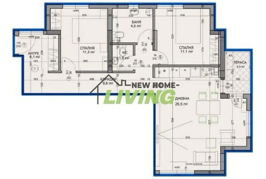 Разпределение: хол с кухненски кът и трапезария, две спални, две бани с тоалетни, входно антре, тераса и избено помещение.