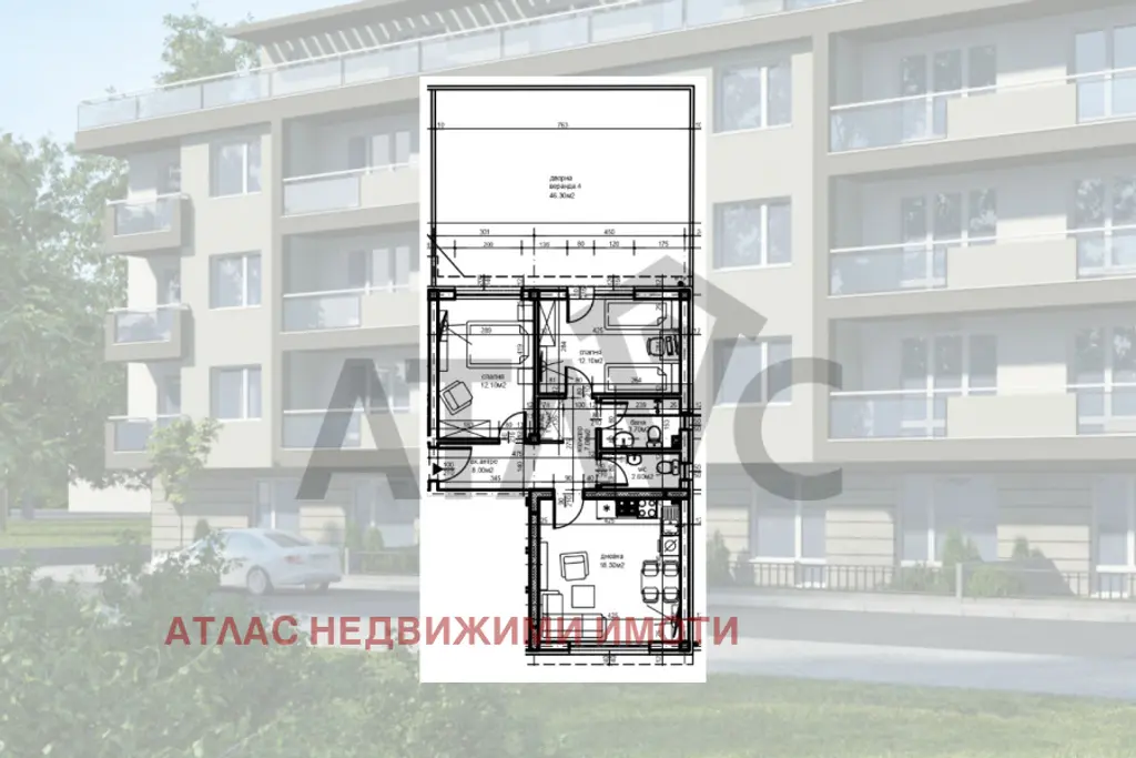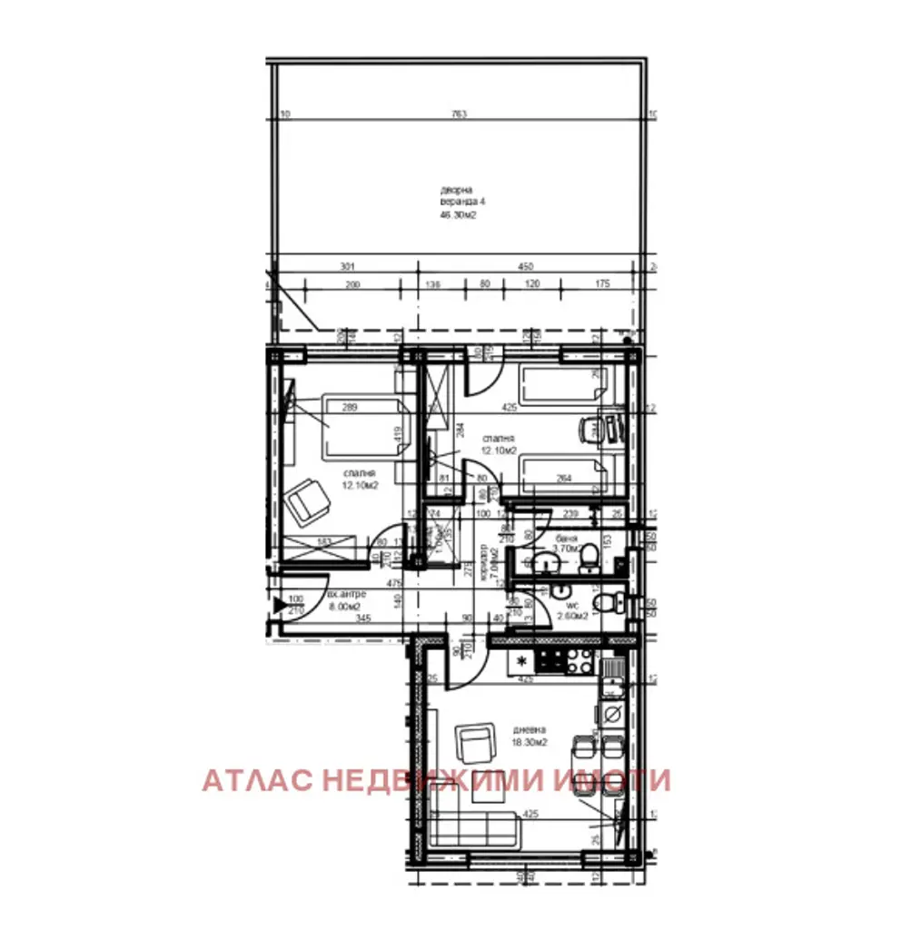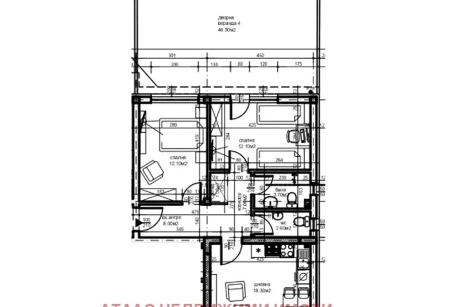 Апартаментът е с добре обмислено разпределение и включва светъл хол с кухненски бокс и трапезария, две спални, баня с тоалетна, отделна тоалетна, практичен килер, входно антре и чудесна дворна веранда с площ от 46,30 кв.м., подходяща за релакс. Жилището е проектирано с акцент върху комфорта и качеството на живот. За удобство на бъдещите собственици се предлага възможност за закупуване на подземни гаражи или паркоместа в комплекса.