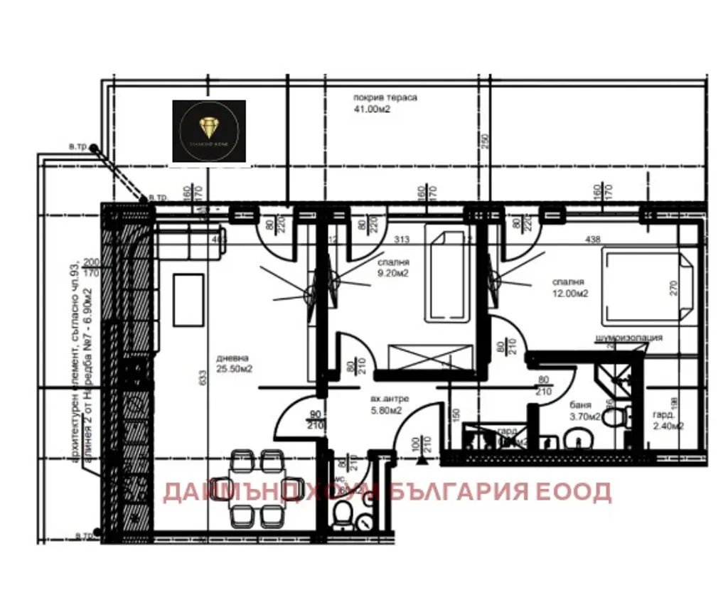 - 📐разпределение: Вх. антре, баня с wc, дневна с кухн. част, две спални и покрив. тераси.