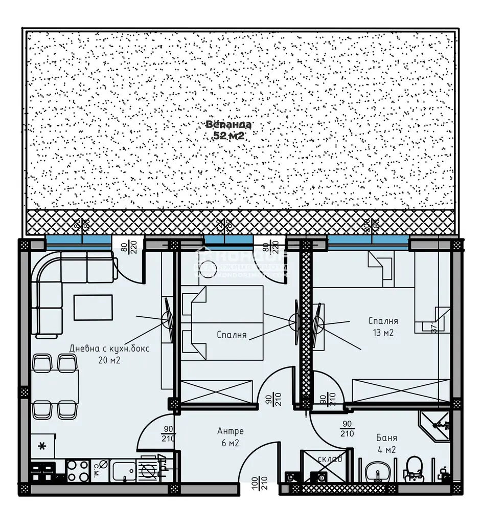 Оферта 63280:Сега имате възможността да си закупите функционален 3 - стаен апартамент в малка новоизградена луксозна сграда, проектирана така, че да създаде максимален комфорт и уют с изключително нисък процент общи части - 13.00 %. Страхотна Локация в един от най-бързо развиващите се райони с нискоетажно застрояване на тихо и спокойно място в близост до всички необходими комуникации. Жилището се състои от слънчева дневна с трапезария и кухненски бокс, две самостоятелни спални, баня с тоалетна, входно антре със склад и една прекрасна дворна веранда 52кв.м., обща и за всички стаи. Обектът е построен от фирма с доказан опит и множество завършени проекти , осъществени с висококачествени материали и съвременни технологии, по европейски стандарти, шесткамерна PVC дограма, червена Австрийска Тухла, масивна Блиндирана входна врата с 4-странно заключване, сензорно осветление, хидравлични асансьори с огледална кабина. Свободни Паркоместа в двора на цени от 13000 евро!!! Възможност за закупуване чрез Банков Кредит или на разсрочено плащане в рамките на строителството !!! ЧУДЕСНА ИНВЕСТИЦИЯ! Възползвайте се от възможността да живеете в малка бутикова сграда.