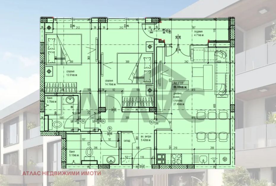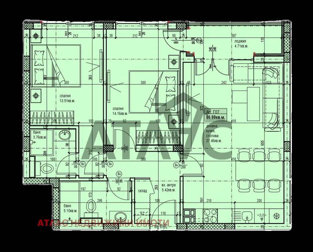 Тристаен апартамент! Жилището е с площ 100,73 кв.м. и е с отлично разпределение: просторна дневна с кухня и трапезария, две самостоятелни спални, две бани с тоалетни, входно антре, склад и тераса.