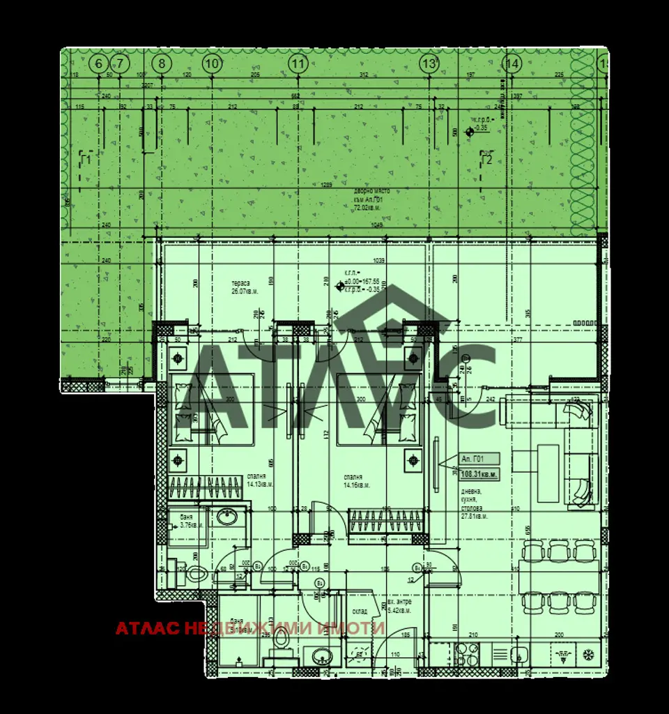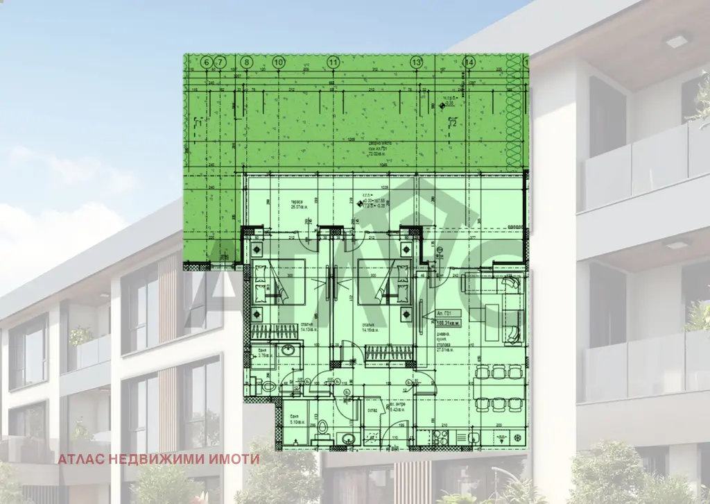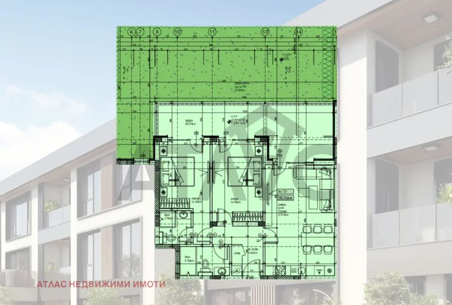 Към апартамента принадлежи и собствен двор с площ 72.08 кв.м., достъпен директно от дневната и спалните. Това осигурява повече пространство и удобство, както и възможност за зелена градина или кът за релакс.