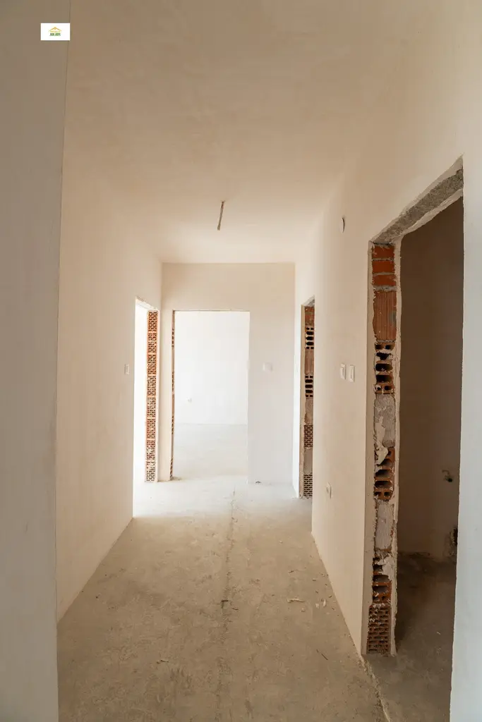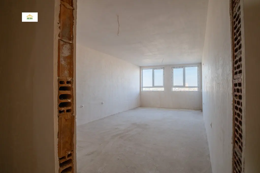 115 кв.м, разпределени в просторна дневна с кухненски бокс, две самостоятелни спални, две бани с тоалетна, дрешник, две малки тераси. Изложение: север-юг с откриващ се изгред към Старият град и Родопите. Издаваме на шпакловка и замазка.